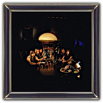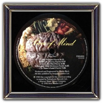The photograph depicts the band sitting at a large table with, in the front, some 'Food For Thought' which was the supposed title of the album. Later on, they decided to change the title to the stronger 'Piece of Mind'. Eddies brain / mind!