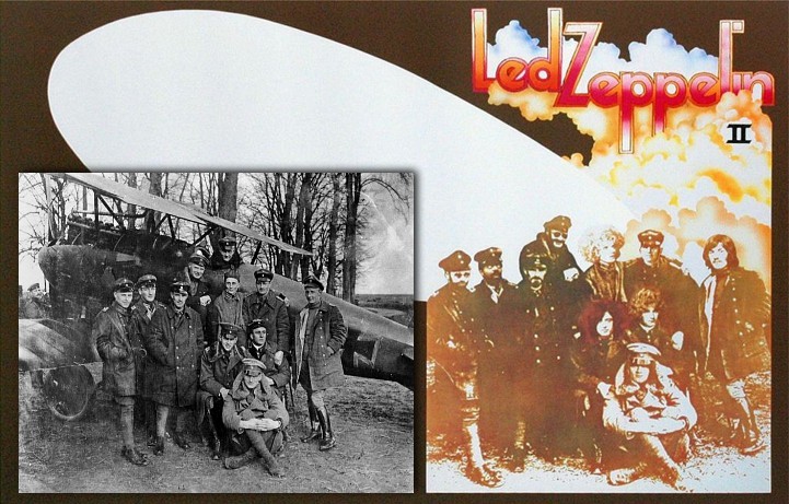 After the picture was tinted, the faces of the four members of the band were airbrushed on it from a 1969 publicity photograph. The cover also pictured the outline of a Zeppelin on a brown background, which gave the album its nickname "Brown Bomber" - Click photo to enlarge / then reset
